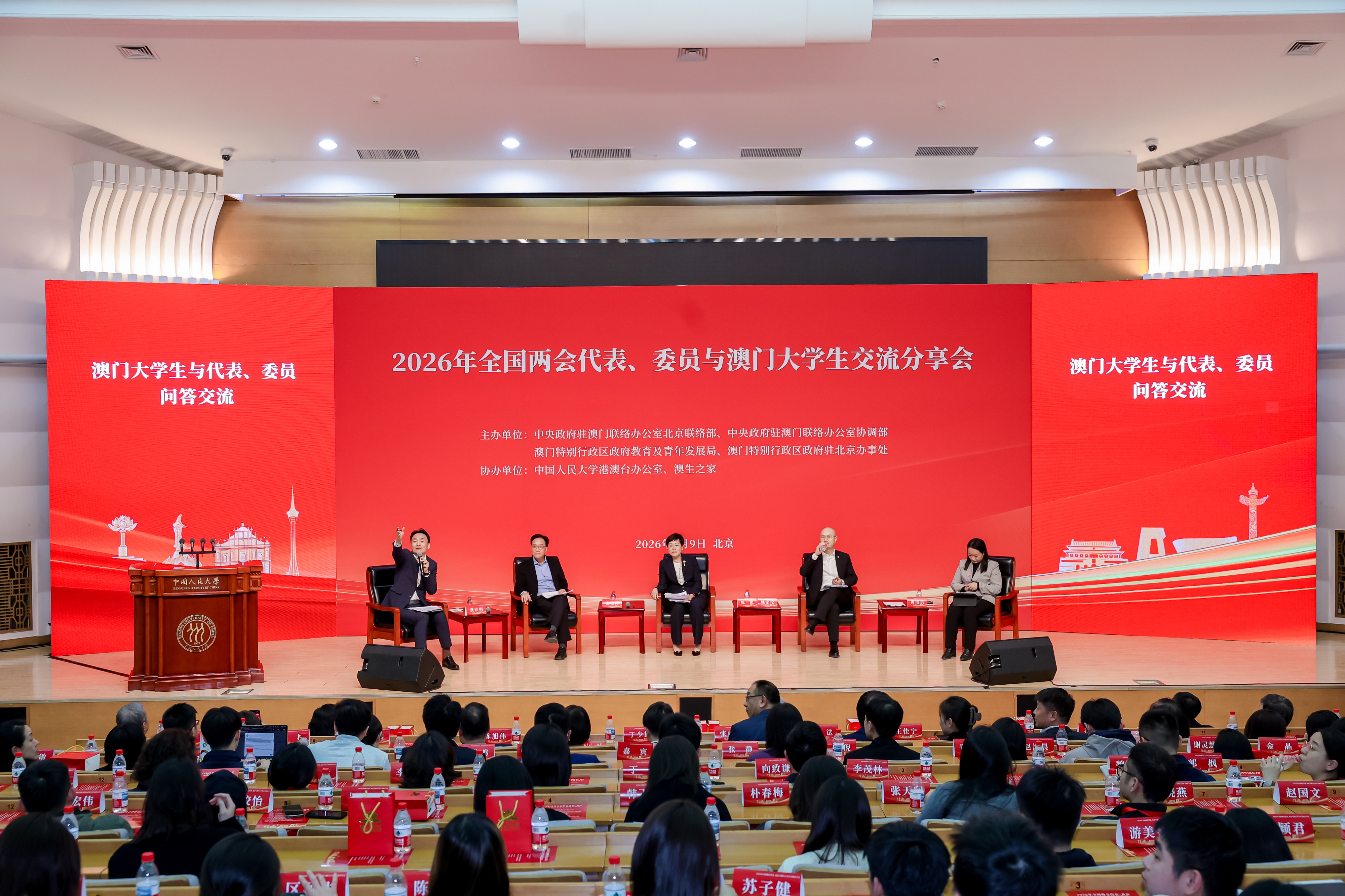 近日,“2026年全国两会代表委员与澳门大学生交流分享会”在中国人民大学逸夫会堂举行。澳门特区全国人大代表陈虹、施家伦以及澳区全国政协委员高锦辉、黄洁贞分享全国两会精神,并与来自北京、天津等地近30多所高校约260名澳门大学生进行交流。