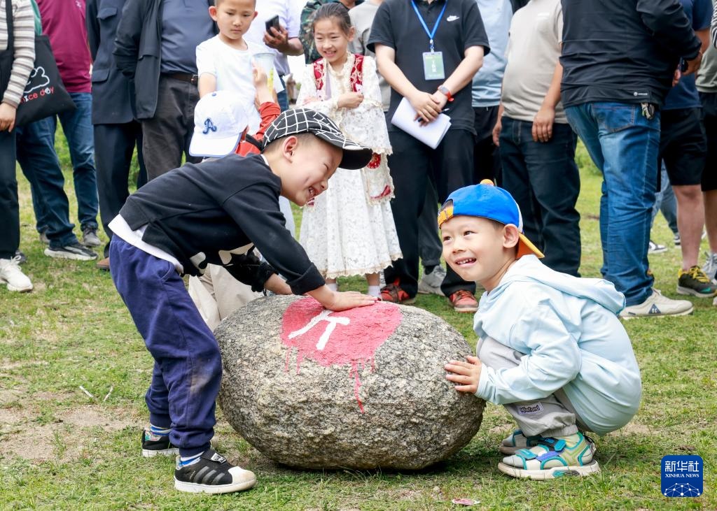 5月24日,在新疆阿勒泰市汗德尕特蒙古族乡,两名小游客在抱石头比赛间隙尝试推动巨石。新华社记者 王菲 摄