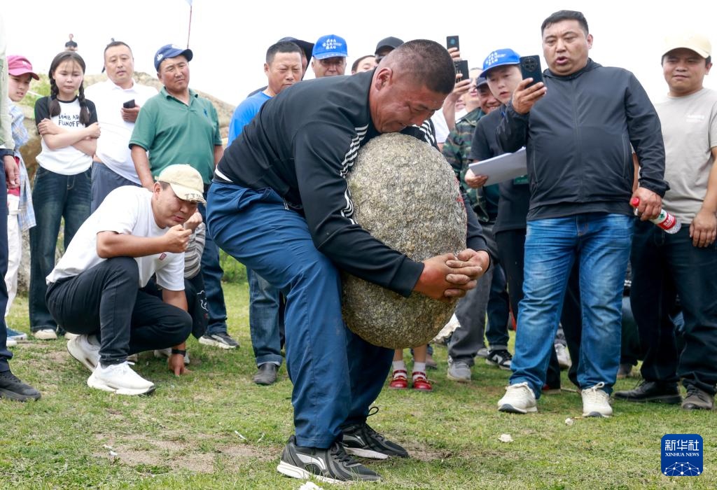 5月24日,在新疆阿勒泰市汗德尕特蒙古族乡,选手在参加抱石头比赛。新华社记者 王菲 摄