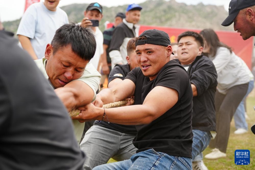 5月24日,在新疆阿勒泰市汗德尕特蒙古族乡,选手参加拔河比赛。新华社记者 徐宏岩 摄