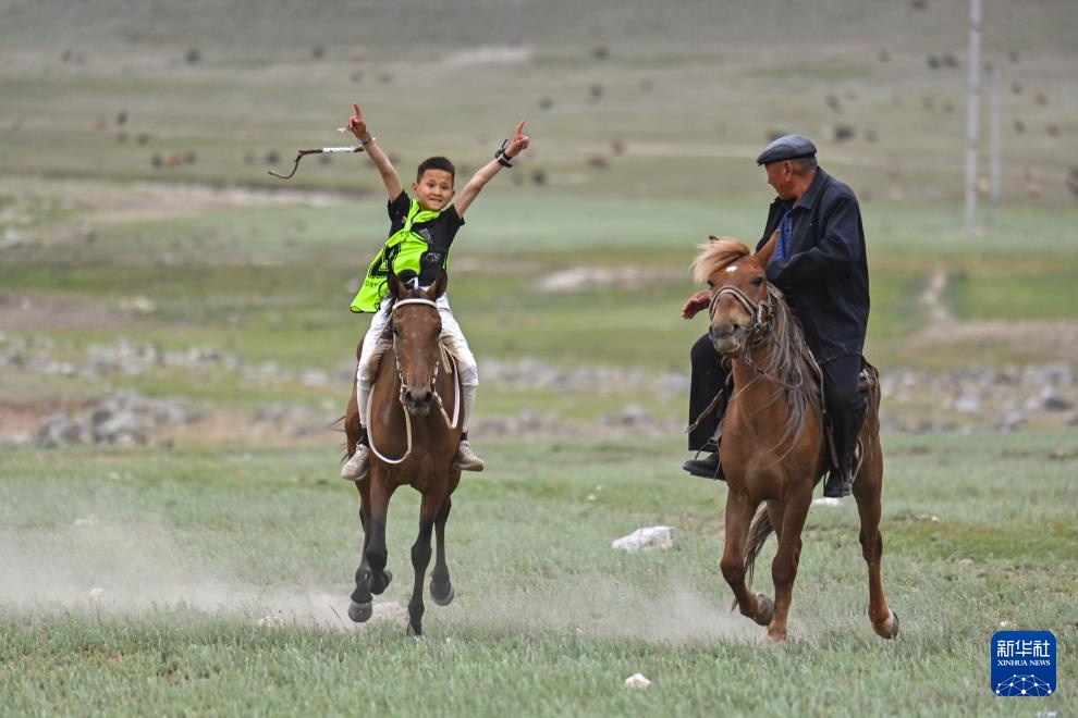 5月24日,在新疆阿勒泰市汗德尕特蒙古族乡,13岁的赛马选手卓玛尔提·卡德尔别克(左)取得第一名后庆祝。新华社记者 徐宏岩 摄