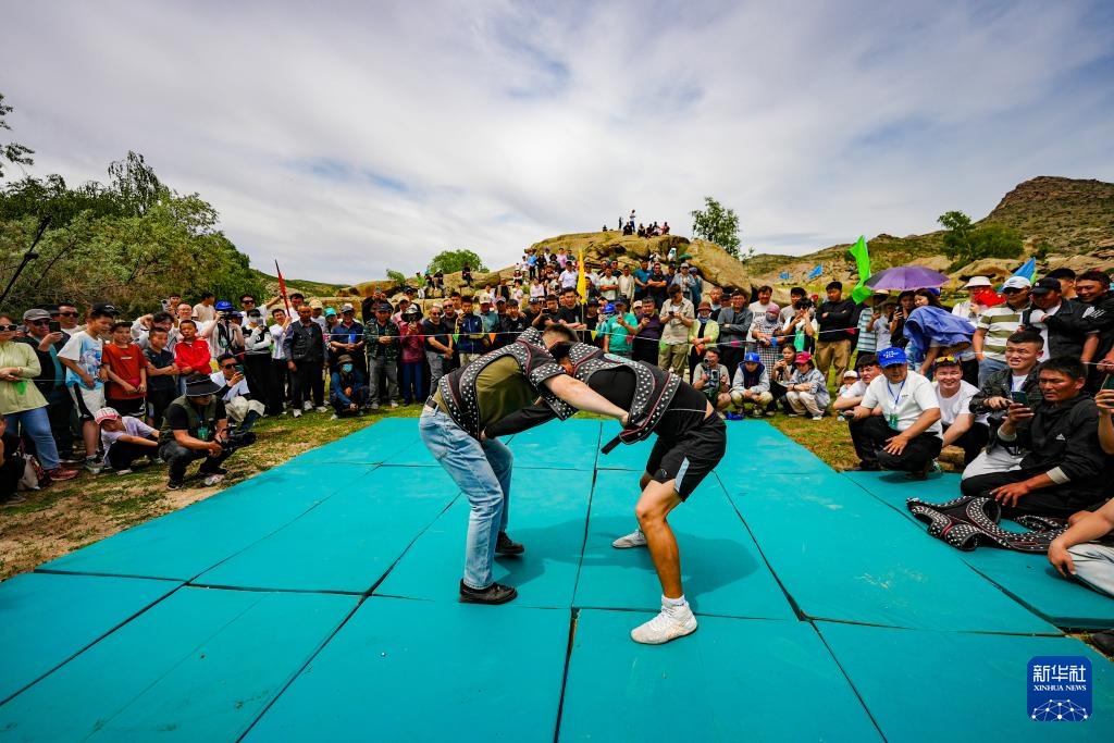 5月24日,在新疆阿勒泰市汗德尕特蒙古族乡,选手参加摔跤比赛。新华社记者 徐宏岩 摄